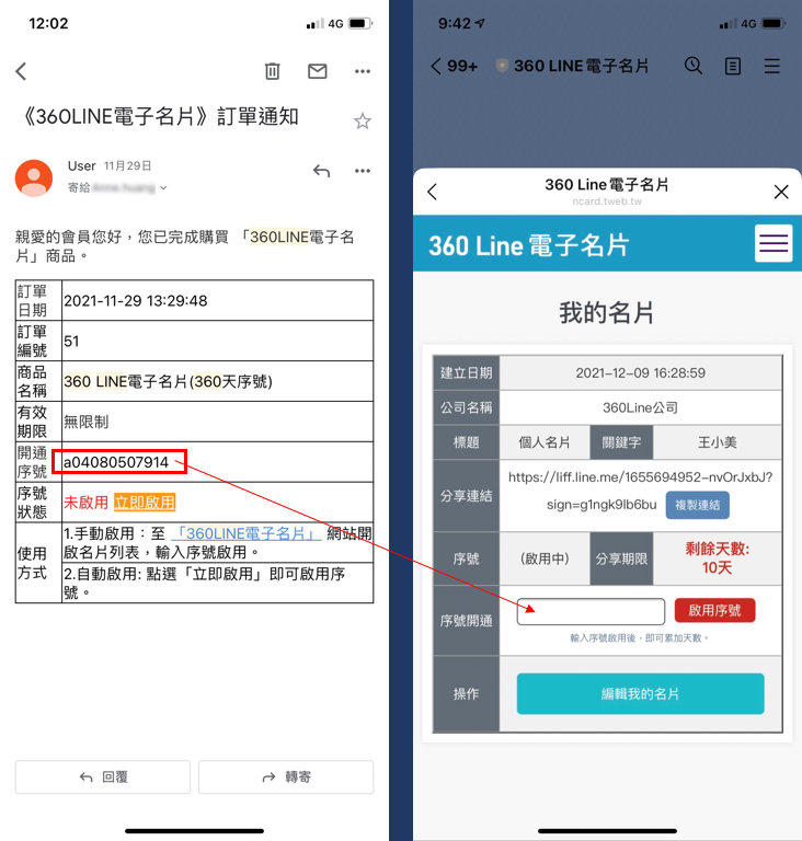 目錄 搜索 展開 360LINE電子名片一、購買流程1.購買序號2.至購物車結帳3.填寫帳單地址 (非必填)4.確認付款方式5.確認訂單6.訂單提交7.匯款完成,啟用序號二、開通、啟用序號流程1.搜尋ID : @360line 加入2.點選註冊/登入3.會員帳號設置三、啟用序號方法(一)方法(二)四、360LINE官方帳號使用說明1.查找名片2.我的名片3.分享我的名片4.編輯名片5.推薦好友6.會員資料 暫無相關搜索結果! 閱讀次數:738 本文檔使用 CLEARONE 發布 7.匯款完成,啟用序號 7.至註冊郵箱收取開通序號啟用作者:Anne 创建时间:2022-06-20 11:16最后编辑:Anne 更新时间:2022-06-21 09:03