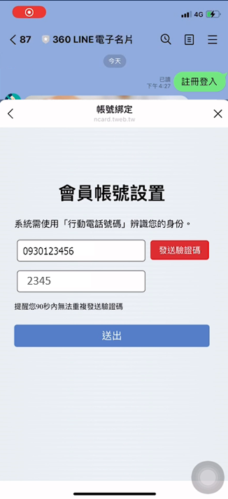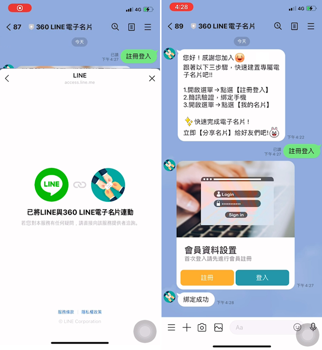 目錄 搜索 展開 360LINE電子名片一、購買流程1.購買序號2.至購物車結帳3.填寫帳單地址 (非必填)4.確認付款方式5.確認訂單6.訂單提交7.匯款完成,啟用序號二、開通、啟用序號流程1.搜尋ID : @360line 加入2.點選註冊/登入3.會員帳號設置三、啟用序號方法(一)方法(二)四、360LINE官方帳號使用說明1.查找名片2.我的名片3.分享我的名片4.編輯名片5.推薦好友6.會員資料 暫無相關搜索結果! 閱讀次數:748 本文檔使用 CLEARONE 發布 3.會員帳號設置 3.1 填入簡訊驗證碼,驗證成功! 3.2 點擊連結連動,完成認證! 3.3 綁定成功!作者:Anne 创建时间:2022-06-20 13:37最后编辑:Anne 更新时间:2022-06-21 08:59