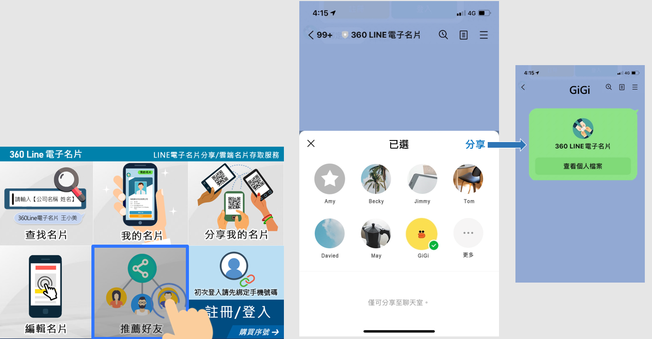 目錄 搜索 展開 360LINE電子名片一、購買流程1.購買序號2.至購物車結帳3.填寫帳單地址 (非必填)4.確認付款方式5.確認訂單6.訂單提交7.匯款完成,啟用序號二、開通、啟用序號流程1.搜尋ID : @360line 加入2.點選註冊/登入3.會員帳號設置三、啟用序號方法(一)方法(二)四、360LINE官方帳號使用說明1.查找名片2.我的名片3.分享我的名片4.編輯名片5.推薦好友6.會員資料 暫無相關搜索結果! 閱讀次數:732 本文檔使用 CLEARONE 發布 5.推薦好友 5.推薦好友分享「360Line電子名片」官方帳號給朋友。作者:Anne 创建时间:2022-06-20 14:39最后编辑:Anne 更新时间:2022-06-21 08:41